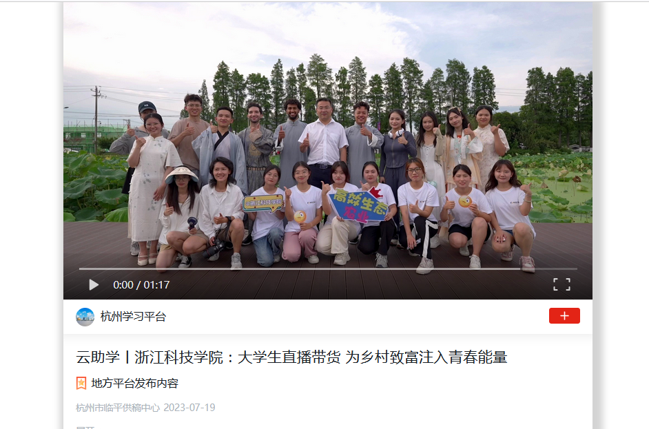近日,浙江科技学院大学生暑期实践团来到杭州市临平区运河街道,将当下流行的直播和集市活动相结合,助力宣传、售卖当地农产品。