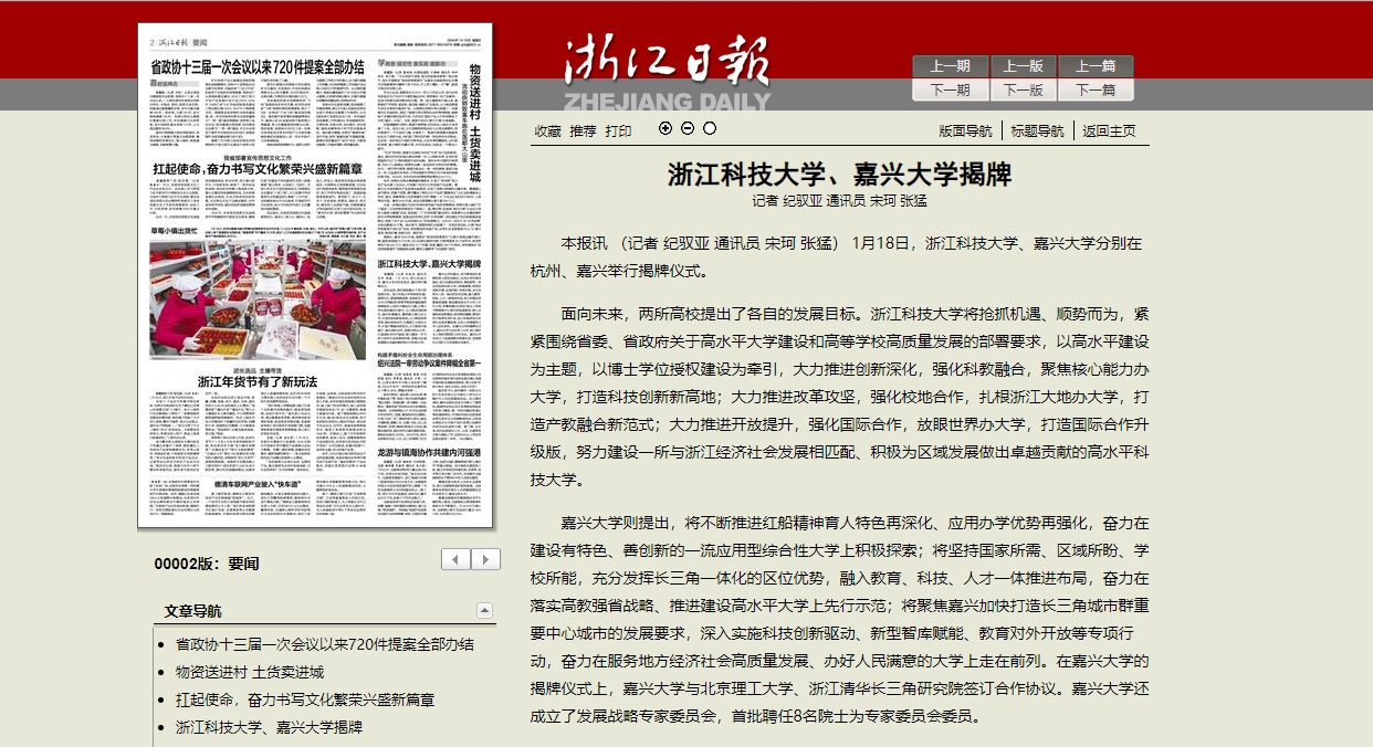 嘉兴大学则提出,将不断推进红船精神育人特色再深化、应用办学优势再强化,奋力在建设有特色、善创新的一流应用型综合性大学上积极探索;将坚持国家所需、区域所盼、学校所能,充分发挥长三角一体化的区位优势,融入教育、科技、人才一体推进布局,奋力在落实高教强省战略、推进建设高水平大学上先行示范;将聚焦嘉兴加快打造长三角城市群重要中心城市的发展要求,深入实施科技创新驱动、新型智库赋能、教育对外开放等专项行动,奋力在服务地方经济社会高质量发展、办好人民满意的大学上走在前列。在嘉兴大学的揭牌仪式上,嘉兴大学与北京理工大学、浙江清华长三角研究院签订合作协议。嘉兴大学还成立了发展战略专家委员会,首批聘任8名院士为专家委员会委员。