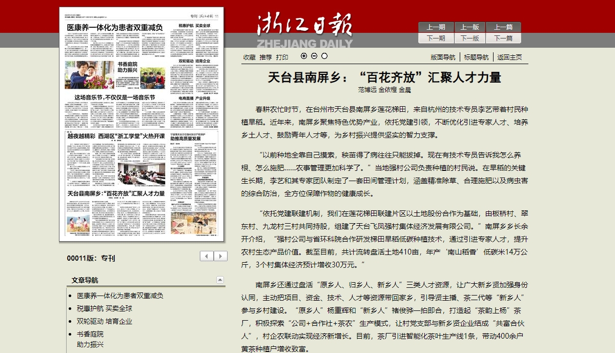 浙江日报:天台县南屏乡:“百花齐放”汇聚人才力量