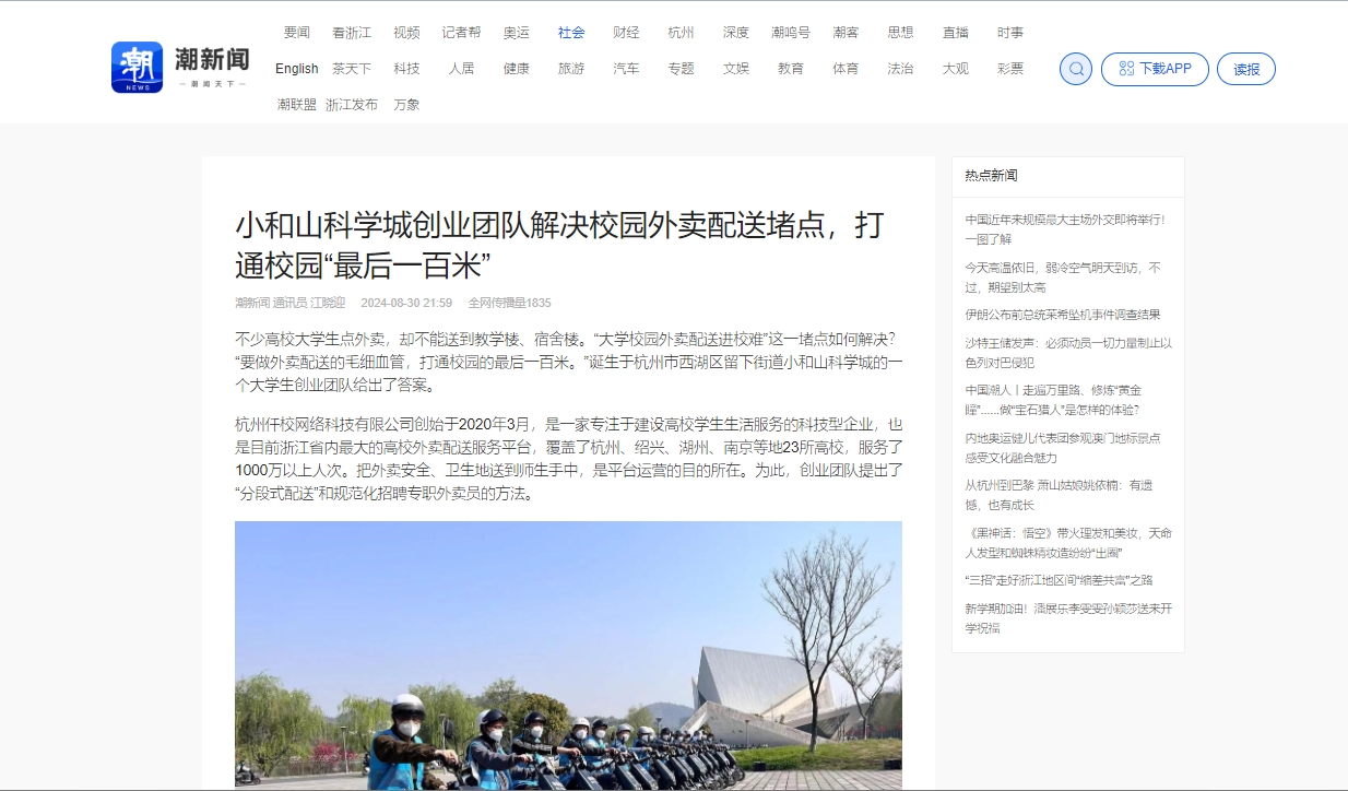 潮新闻客户端:小和山科学城创业团队解决校园外卖配送堵点,打通校园“最后一百米”