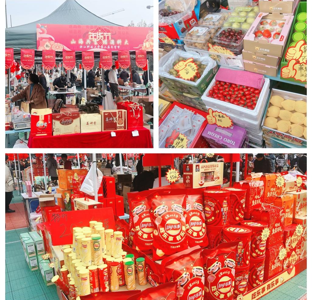 本次年货节为期3天,集合八方美食,40余家摊位、1000余种源头农特产汇聚。年货节亮点多多,更加关注“助农”“暖心”“助弱济困”,除了浙江本土26县助农产品,还吸引了来自新疆、青海、四川、湖北恩施等地11家农优产品供应商,品类涵盖师生感兴趣的地方特色、粮油副食、绿色食品、新鲜水果、年花等。现场还设有年俗文化写福字对联、学校定制红包、棉花糖DIY、集赞领福袋等互动体验。