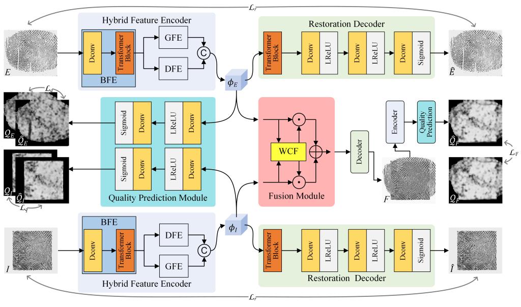 内部指纹提取技术的发展推动了外部与内部指纹融合,为解决指尖表皮磨损、老化致自动指纹识别系统(AFIS)性能下降问题提供了方案。传统图像融合侧重信息最大化,但指纹的皱纹、疤痕等特征产生的高梯度变化信息不利于高质量指纹生成。为此,论文提出基于质量驱动的指纹融合方法,模型由混合特征编解码器、质量预测模块和 WCF 融合模块组成,采用联合优化的组合损失函数与异步交叉训练策略,形成闭环质量驱动融合机制。该方法为提升身份安全认证中的指纹识别性能提供了一条新的研究路径。研究工作得到国家自然科学基金项目、浙江省自然科学基金项目的资助。