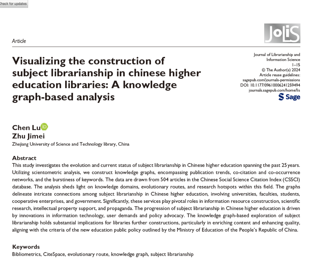 《Visualizing the construction of subject librarianship in Chinese higher education libraries: A knowledge graph-based analysis》一文,研究通过科学计量学分析CSSCI数据库文献,揭示中国高等教育学科馆员制度25年演变及现状。